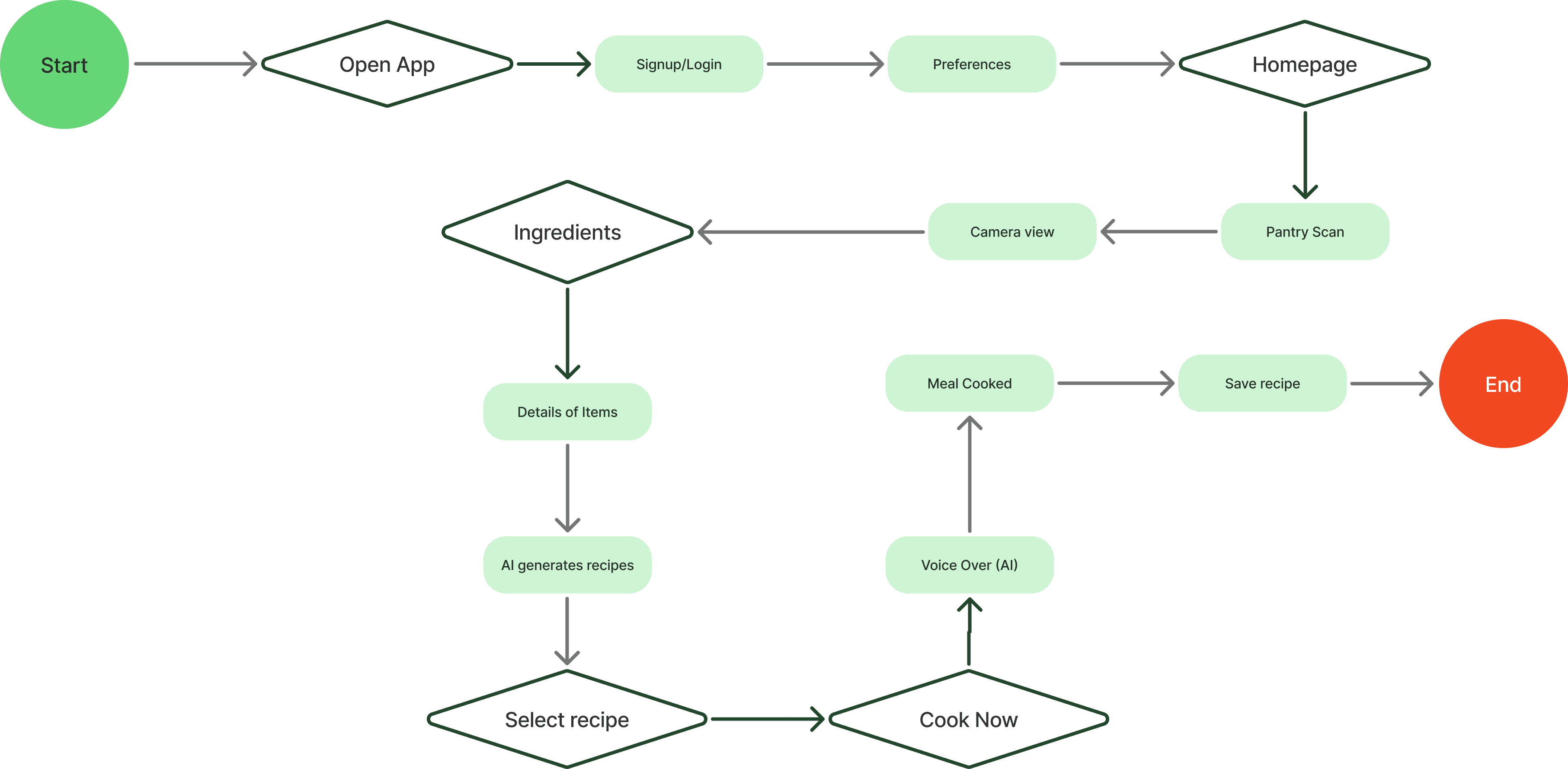 Cooking often feels messy and unstructured, so I built an Information Architecture to turn chaos into clarity, mapping a guided journey for users.