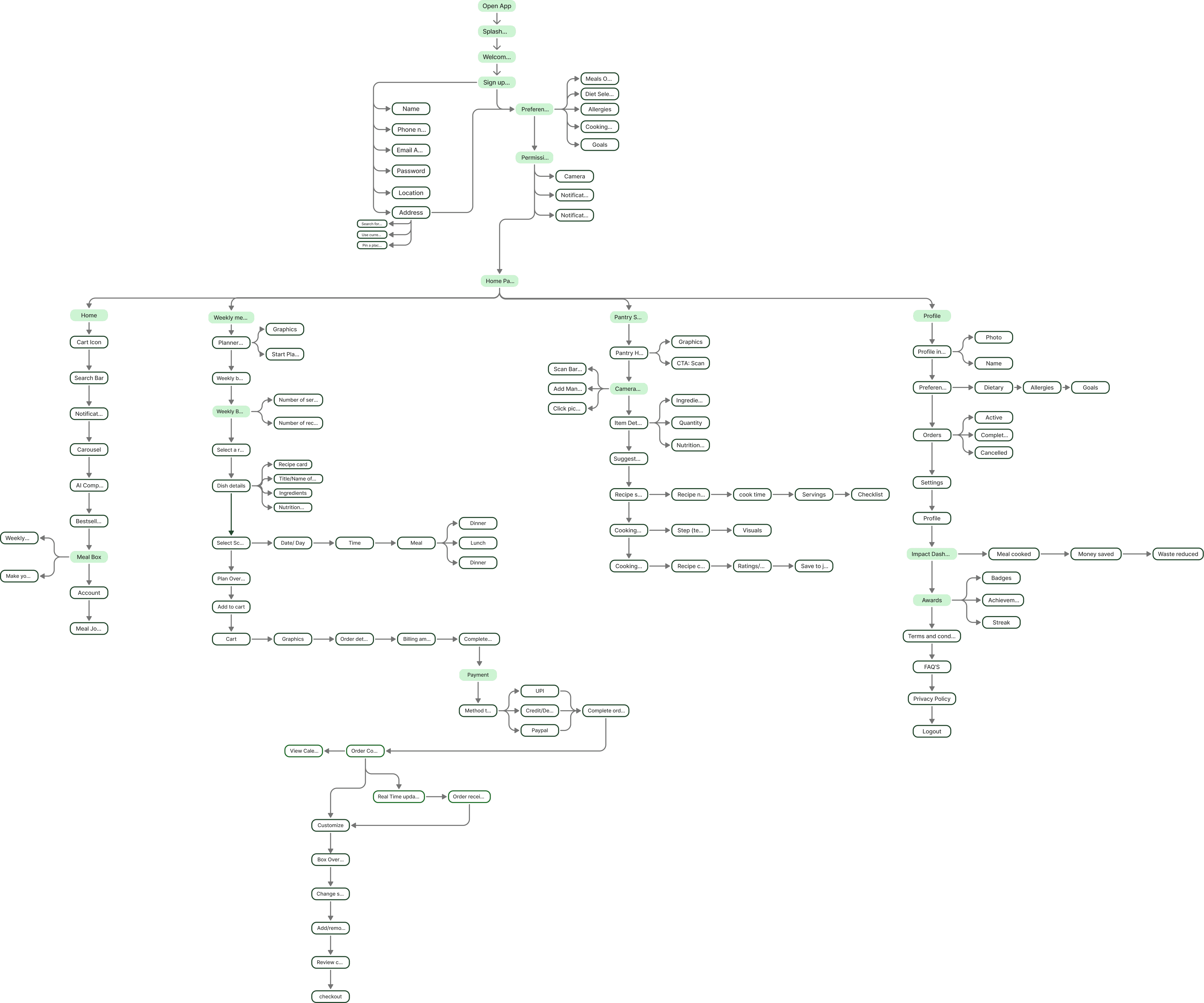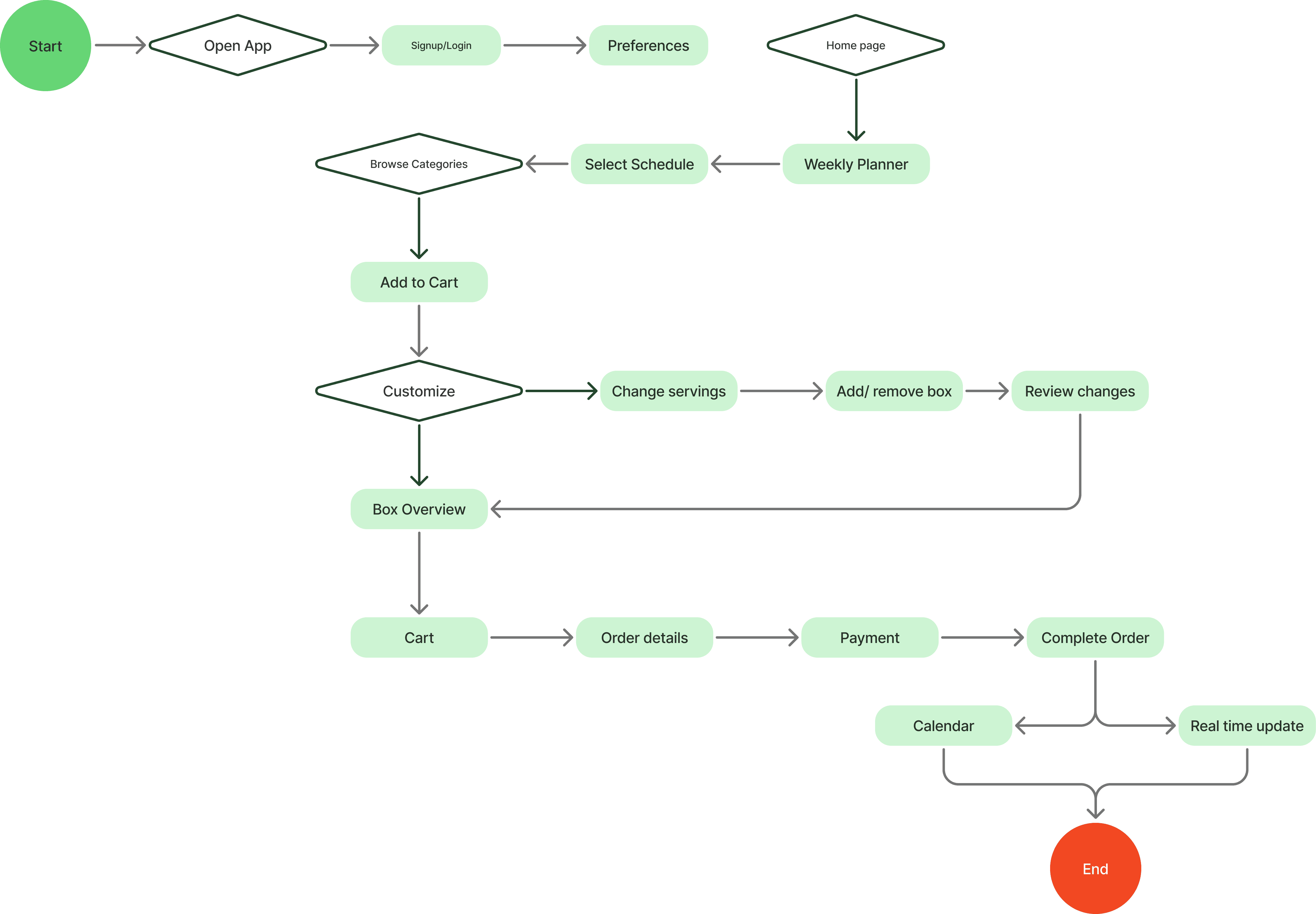 To capture the different ways users approach cooking, I designed two user flows — one showing how busy individuals plan their week and order curated recipe boxes, and another showing how they make the most of existing groceries through pantry scan and AI support. Together, these flows reflect the flexibility of the app to adapt to real-life cooking habits.