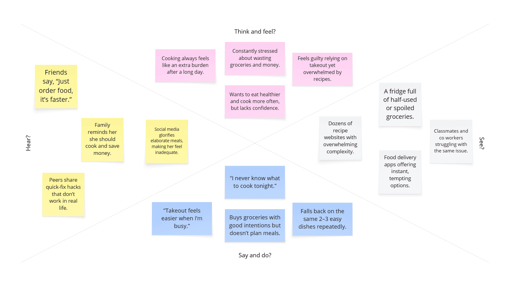 Stepping into Sarah’s shoes meant experiencing the small but heavy moments of her daily life, standing in front of a fridge full of unused groceries, feeling the weight of decision fatigue after a long day, and wishing cooking felt less like a chore and more like a choice. Through the empathy map, I was able to capture not just what she says and does, but also what she thinks and feels, uncovering the frustrations and hopes that would guide the design forward.
